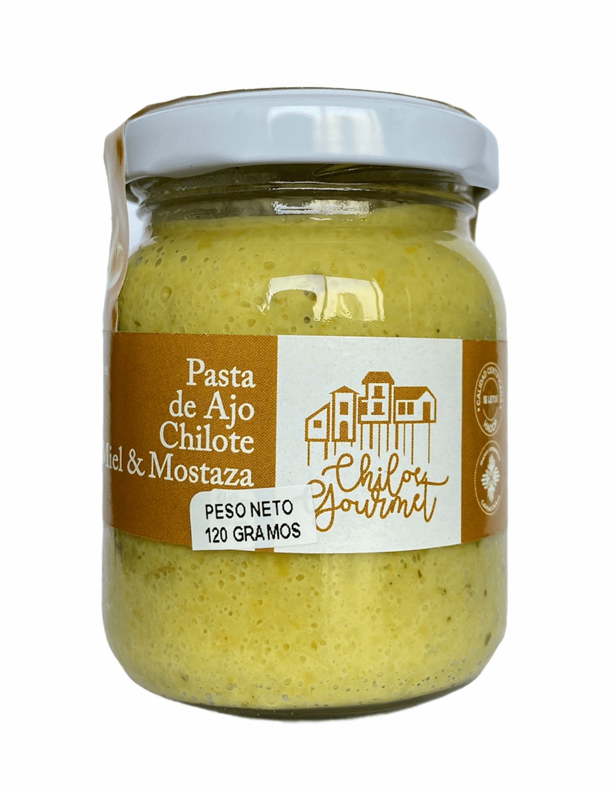 Pasta elaborada con ajo chilote elefante tipico de la isla de Chiloe de sabor menos intenso pero penetrante con un picor natural, adicionado con miel tipica de la region que da un dulzor unico y mostaza que entrega una acidez equilibrante, ideal para carnes de sabor fuerte como cerdo o cordero.